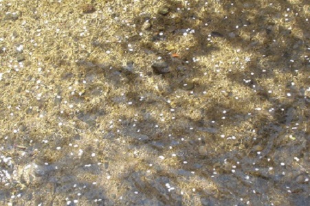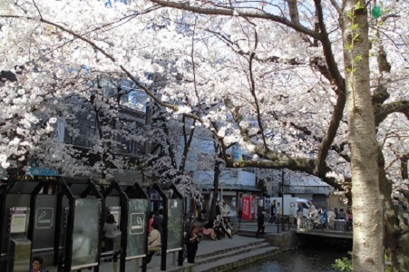 高瀬川の川面に散った 桜の花びらが 流れてます