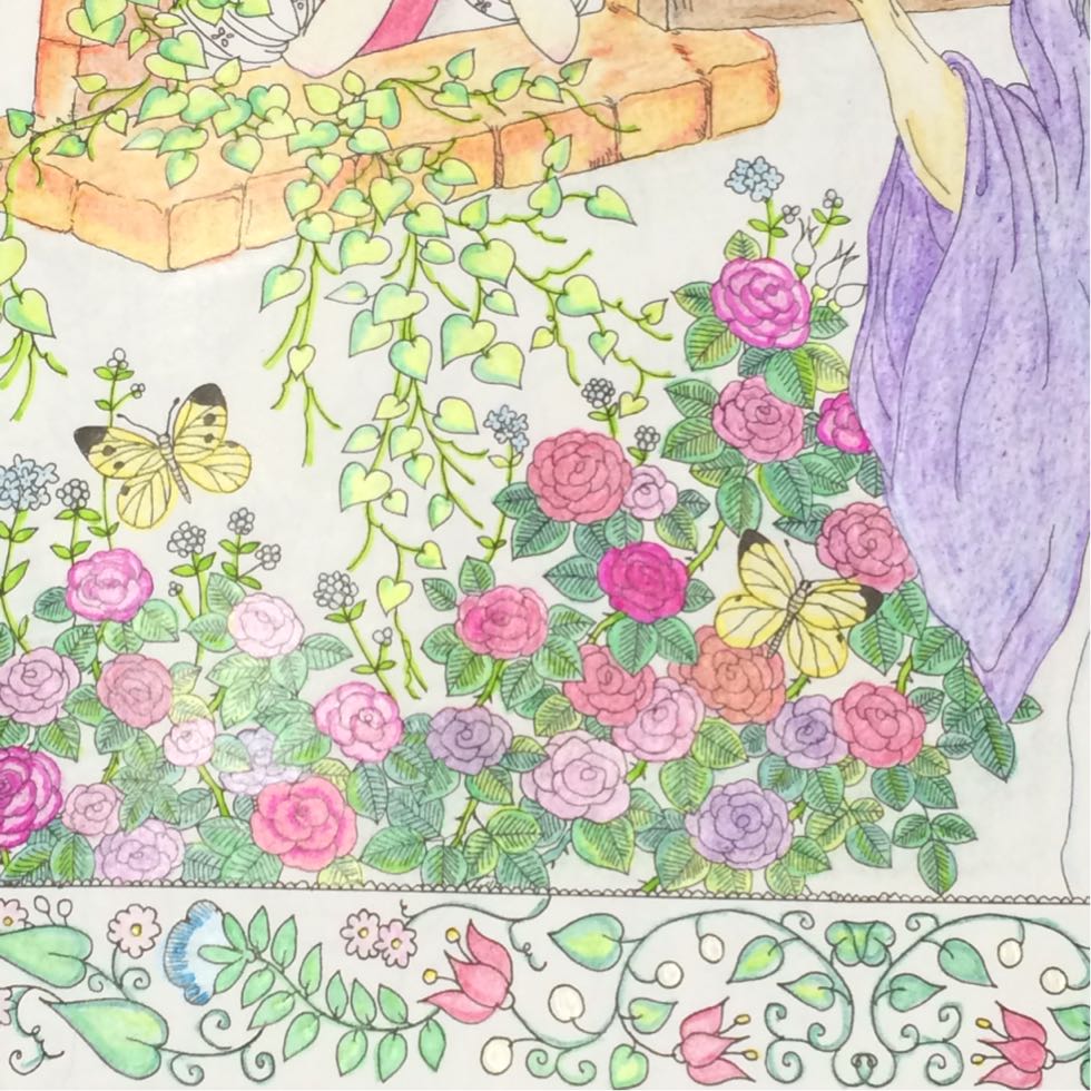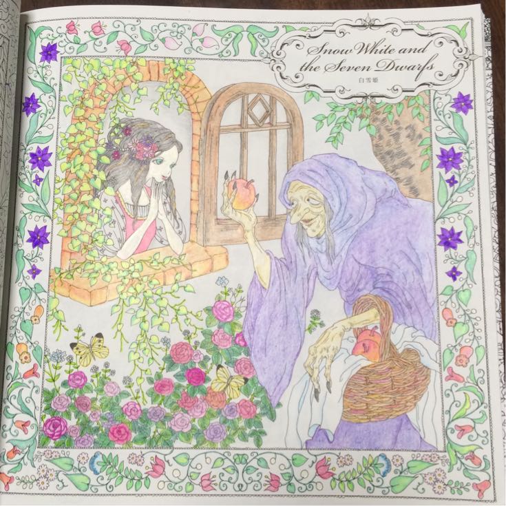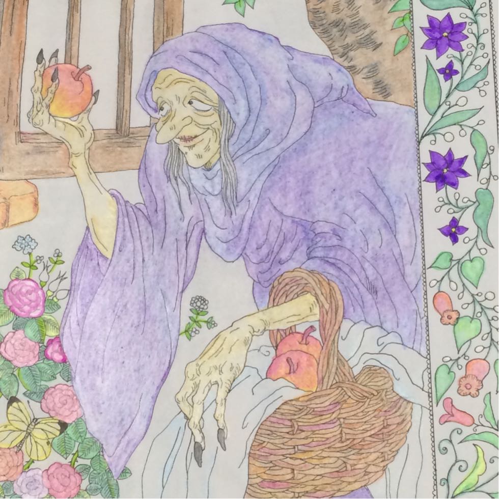 この白雪姫、初めて塗ってこんな凄いとしか私には思えませんが、色鉛筆を変えたらもっとすごいことになるなら、大人の塗り絵というだけの事ありますね⤴