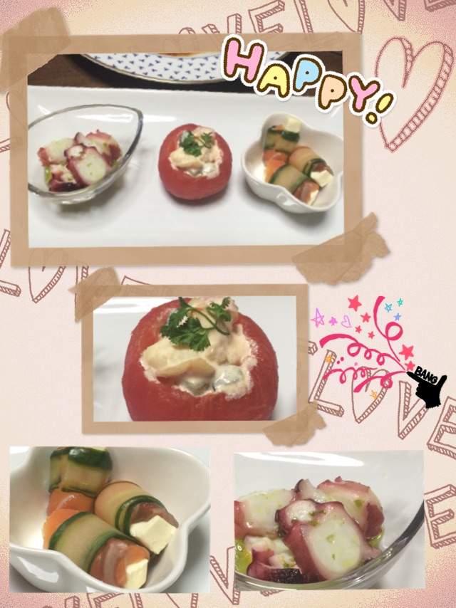真ん中:トマトに 海老・きゅうり・トマトを