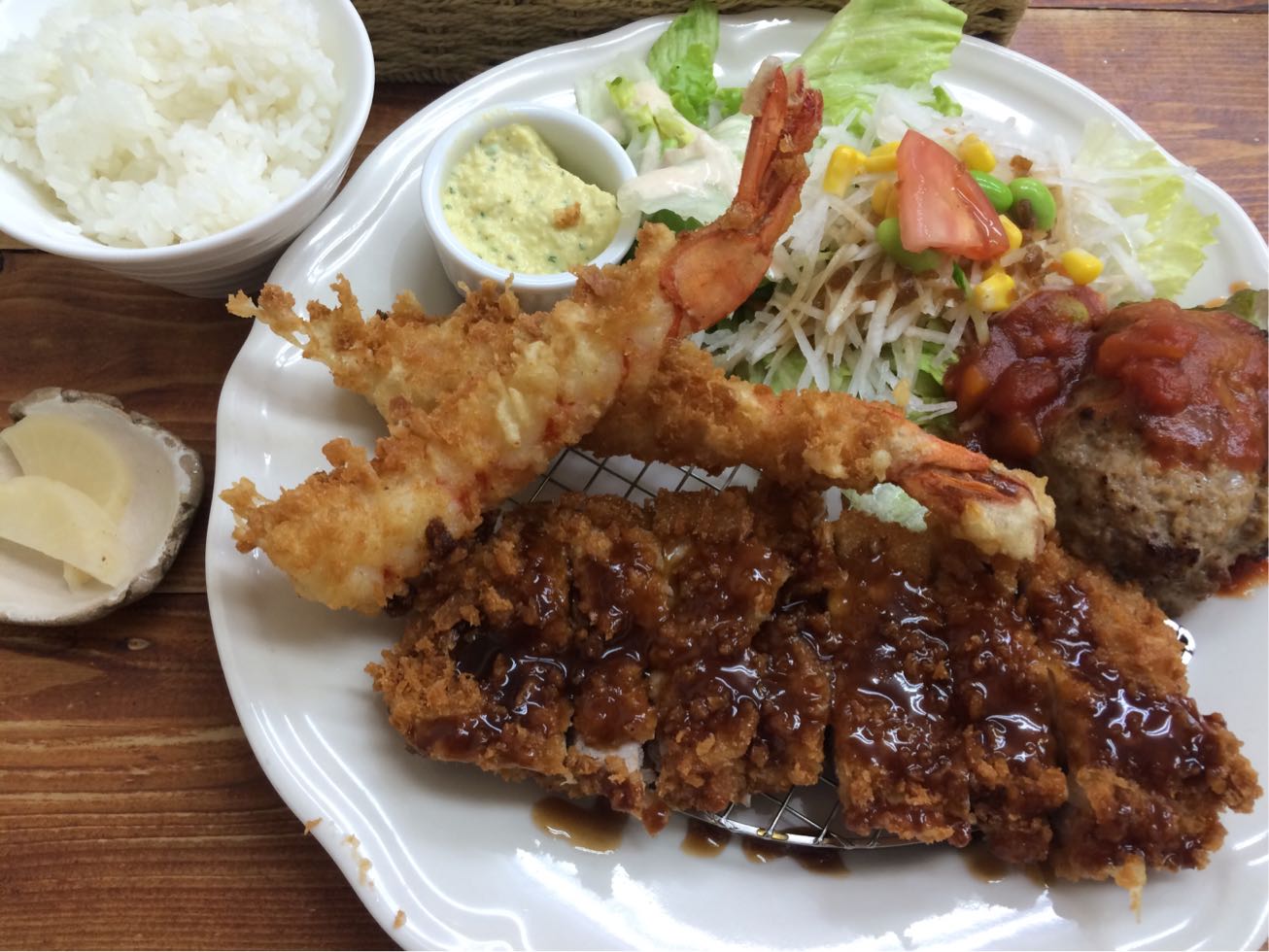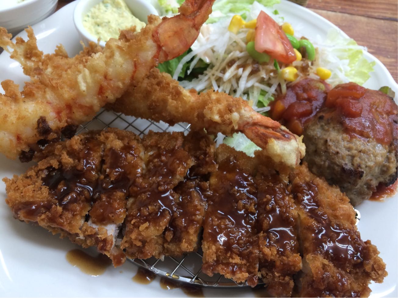 エビフライ、トンカツハンバーグと王道の3品が一皿に乗って、ほんとよくばりですよね~⤴