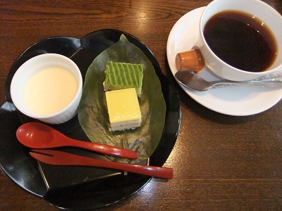 コーヒーか紅茶と プチケーキが2つと プリンが セットになってます