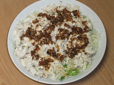 酒蒸ししたささみを 細かく裂いて 千切りキャベツの上に