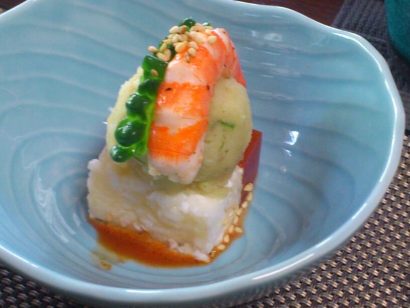 ポテトサラダ その上に 海老とゴーヤが乗ってます