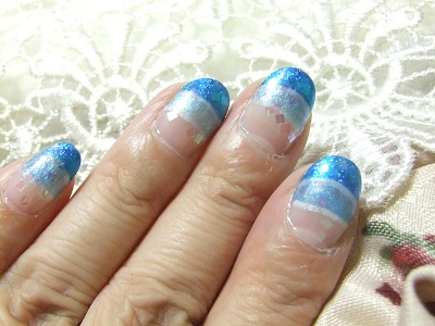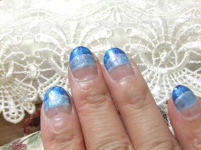 水色と ブルーで ダブルフレンチに ホワイトパールのラインを ひき
