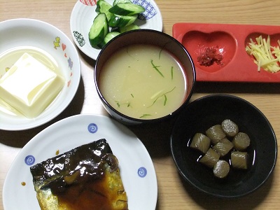 サバの味噌煮・卵豆腐・こんにゃく・きゅうりの浅漬け・冷や汁