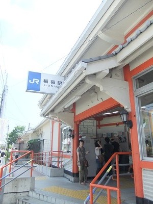 JR稲荷駅 柱や柵が 朱色です