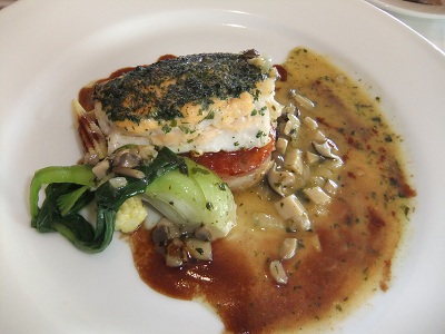 香草のミルフィーユ仕立て 茸と赤ワインソース 山芋と帆立のガレット添え