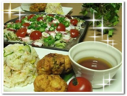 ご飯は 鮭と きゅうりと たくあんの混ぜ寿司にしました