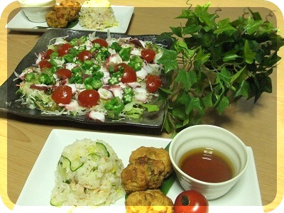 タコのカルパッチョは オクラと トマトを 乗せて 夏らしさ up
