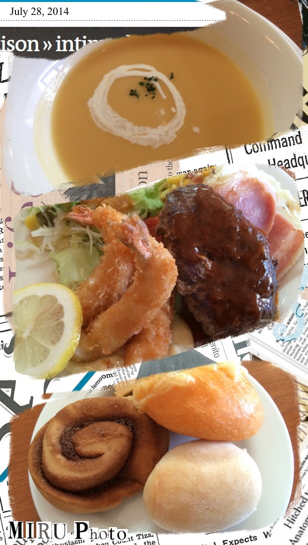 今日は ハンバーグ・海老フライ・ベーコンエッグ(サラダ付き)の