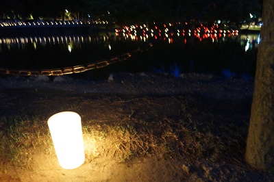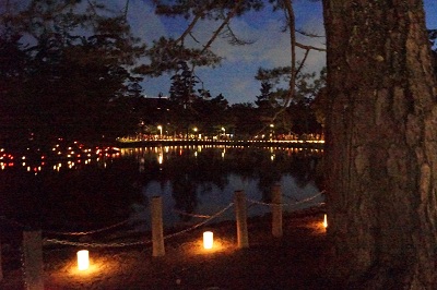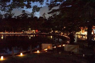 13.14日のみ 中門の前の鏡池の周りにも 火が灯され