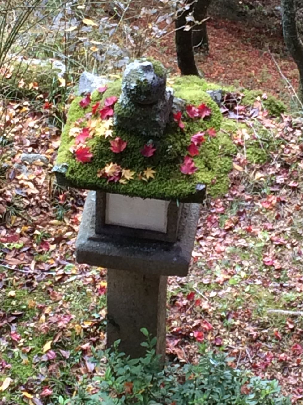 灯籠の苔の上に 紅葉が....