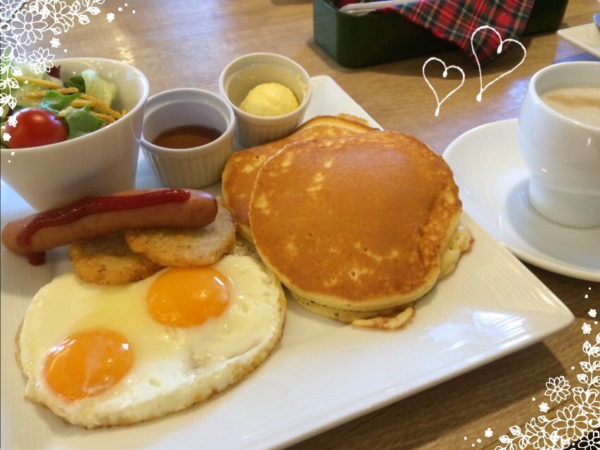 主人と 私は 目玉焼き&サラダのパンケーキモーニング